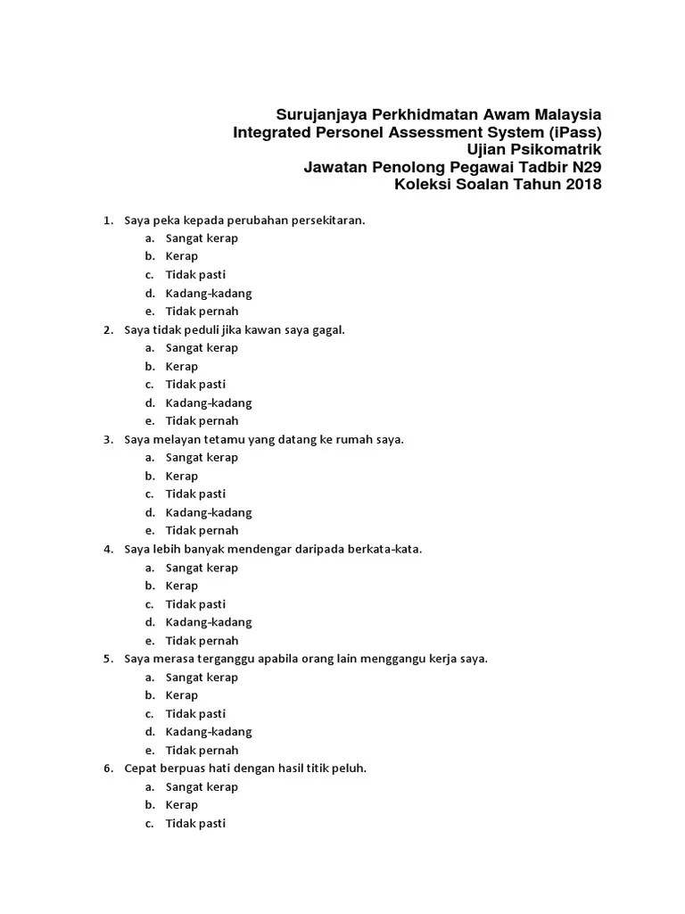 Keputusan Ujian Psikometrik Spa - 200 Soalan Ujian Psikometrik Spa Terkini Tahun 2021 Beserta Jawapan. Bakal majikan menggunakan keputusan daripada ujian ini untuk menentukan sama ada korang sesuai untuk jawatan yang korang apply. Penolong jurutera gred ja29 (jabatan penyiaran malaysia)(sarawak)